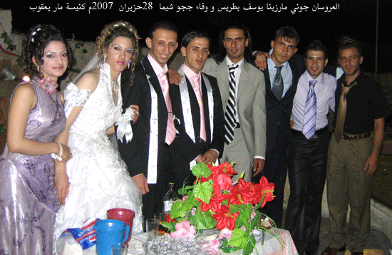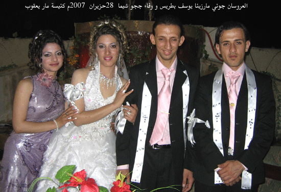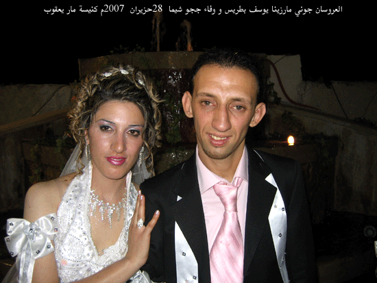 وامام مذبح كنيسة مار يعقوب العروسان: جوني مارزينا يوسف بطريس و وفاء ججو شيما