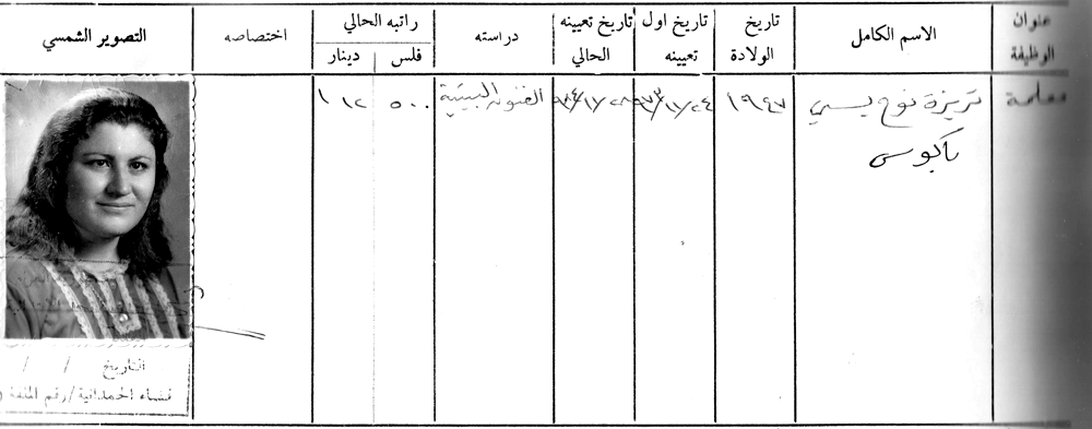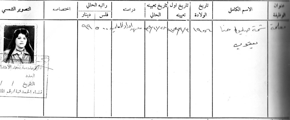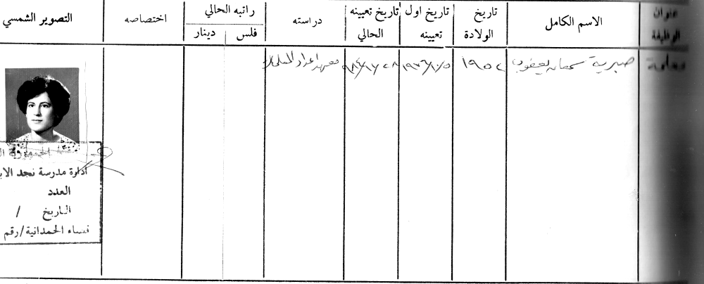 الاسم: الست صبرية سمعان يعقوب كذيا المواليد: 1952 مكان التخرج: معهد اعداد المعلمات تاريخ اول تعين: 5/10/1976