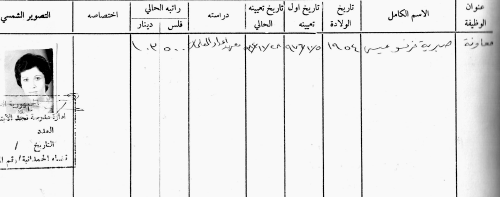 الاسم: الست صبرية فرنسو عيسى عيسو المواليد:1954 مكان التخرج: معهد اعداد المعلمات تاريخ اول تعيين: 5/10/1976
